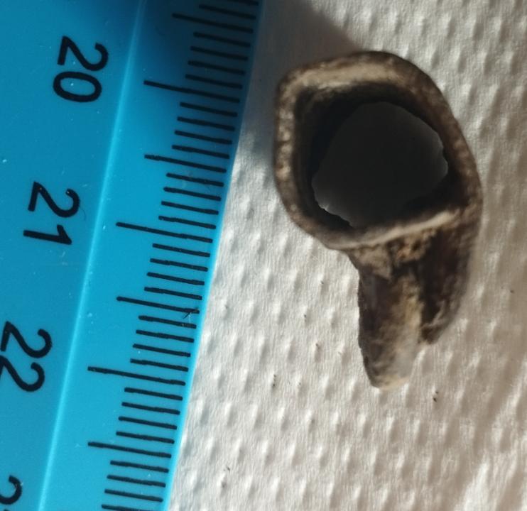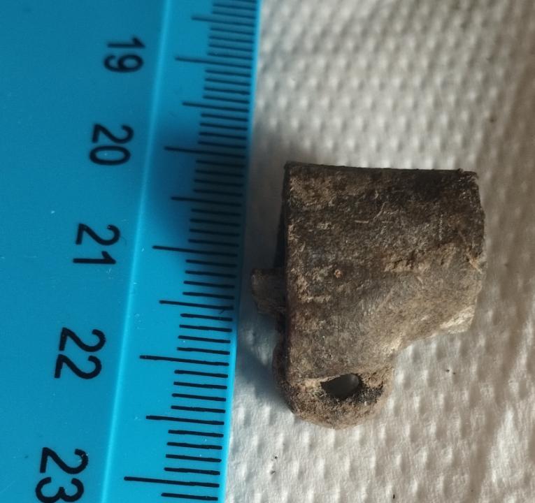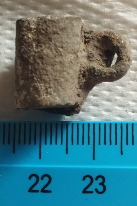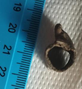 Здравствуйте.Вчера на берегу реки выпала такая штука.Там встречались и наконечники и всякая древнятина. Не для пороха точно по причине крохотности.Может мне показалось что это кружка.Однако дна нет. Патина древняя.