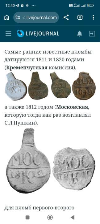 Добрый день. Нужна помощь профессионалов! Найдена товарная пломба Московской приемной комиссии 1811г. Быстрый поиск в интернете привел к статье в ЖЖ , где автор plombomaniak, утверждает , что самая ранняя известная пломба Московской комиссии датируется 1812годом ( скрин). Так вот, хотелось бы разобраться, представляет ли данный экземпляр какую либо ценность.