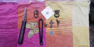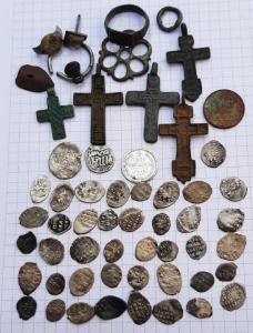 Очень порадовала кучка пятаков, было много положительных эмоций две десятки массонские тоже в зачёт, хоть и какалики, но найдены впервые. Из металлопластики тоже есть приятные Крестики, привески но самый приятный подарок от Деда - этот топорик Ну и серебро всем хорошего настроения и приятных находок!30 баллов