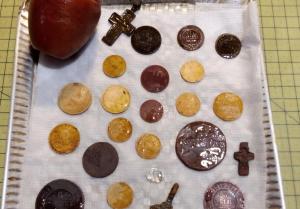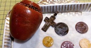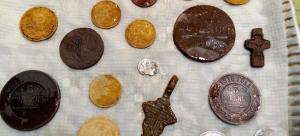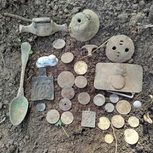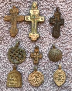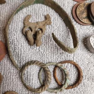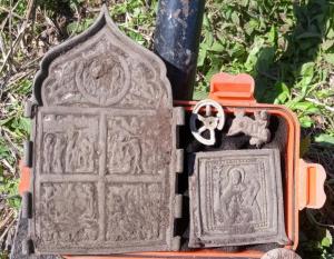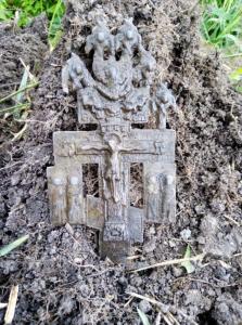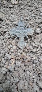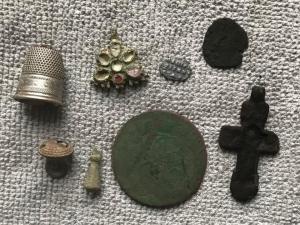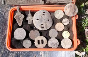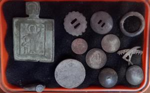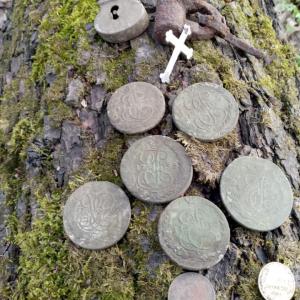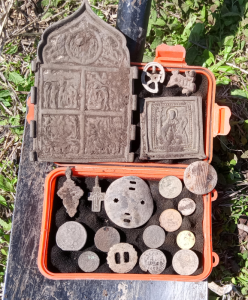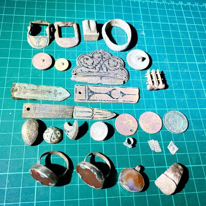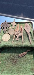 Доброго здравия Вам дорогие ФорумчанЕ ✌️ Вчера ,продолжительное время определялся в какую сторону мне задвигаться, чтобы была возможность и по лесу походить и в случае чего и пошурфить! Остановил свой выбор на хуторе Екатерининских времён ,в 110 км. от города. Воскресный день обещал быть во всех отношениях благоприятным! (по погоде,переменная облачность без дождя 😢опять кто то ошибся). В 5 30 я уже во всю собирался и запихивал в рюкзак только что созданные мной творения бутербродной продукции и термос с ароматным травяным чаем. В 8 30 я был уже на месте! Замечательное,тихое место! Хутор находящийся в овраге, (в этом и была загвоздка😐 после начала дождя!) до ближайшей жилой деревни 15 км. по грунтовой дороге. Зарядившись несколькими глотками ароматного чая и определившись с началом маршрута своих петляний😅 Я пустился в свои скитания по хутору ,в котором когда то давно кипела жизнь! Выхаживал битые фунды и вокруг них, примечал не тронутые,ходил по старой дороге и гулял по лесу! Не заметил как пролетело три часа! В хабарнице кот наплакал: три ранних совета и две конинки. Решил перейти от скитаний к шурфу найденного ,нетронутого фундамента. Спустя минут 40 начал сильно беспокоиться ( керамика, стекло,кирпич лезет не дуром) отсутствием достойных сигналов! За почти час ,две лысых пуговицы и не понятная накладка! Спустя ещё минут 10 всё таки словил сильнейший, чистейший сигнал 😁 подумал ,что крупная империя,но это даже лучше! Нательная иконка друзья! А тем временем на меня надвигались тучи😢 обещали же ,что не будет дождя! Через 20 минут заморосил дождь и временами пока я ещё 20 минут шурфил(безрезультатно) менял несколько раз свою интенсивность! Вот на этом моменте я уже серьёзно забеспокоился, моё сердце от волнения ударилось о рёбра,а разум подсказывал,что пора сваливать пока не поздно!😂 Всё таки верное решение было принято! В гору моя пузотёрка уже поднималась с небольшим трудом, (задницу таскало из стороны в сторону) ещё бы минут 30 промедления и остался бы я там до тех пор пока не просохло! Жаль конечно,что так мало времени получилось покопать,но тем не менее не без находок! Пока я добирался до дома, мой друг и по совместительству наш с вами модератор @Arvest определил нательную иконку29 баллов