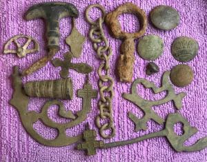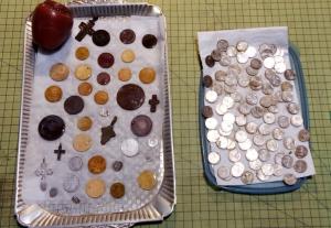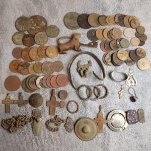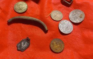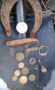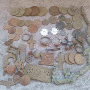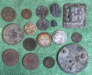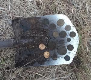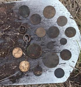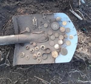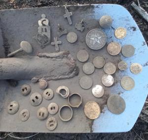 Очень порадовала кучка пятаков, было много положительных эмоций две десятки массонские тоже в зачёт, хоть и какалики, но найдены впервые. Из металлопластики тоже есть приятные Крестики, привески но самый приятный подарок от Деда - этот топорик Ну и серебро всем хорошего настроения и приятных находок!30 баллов