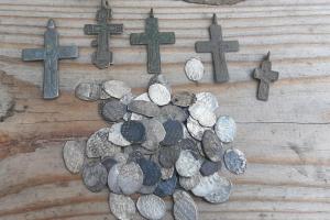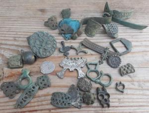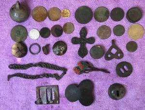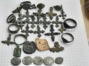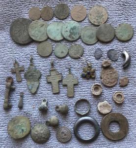 Здравствуйте,уважаемые форумчане. Два выезда суббота и воскресенье.Первый день попал на домонгол в основном одни печальки по находках,но все равно было интересно.Местами проскакивала пятнашка,думаю я её в следующий раз найду.На воскресенье были планы поехать по 16 веку,поле под парами и начало зарастать.Час ходил собирал проволоку,полезных сигналов думал не будет,идя к машине зацепил сигнал,чешуйка Михаила Фёдоровича,потом ещё и много ещё.Итог 75 чешуек и 5 крестиков. Желаю всем удачных выездов.С уважением.28 баллов