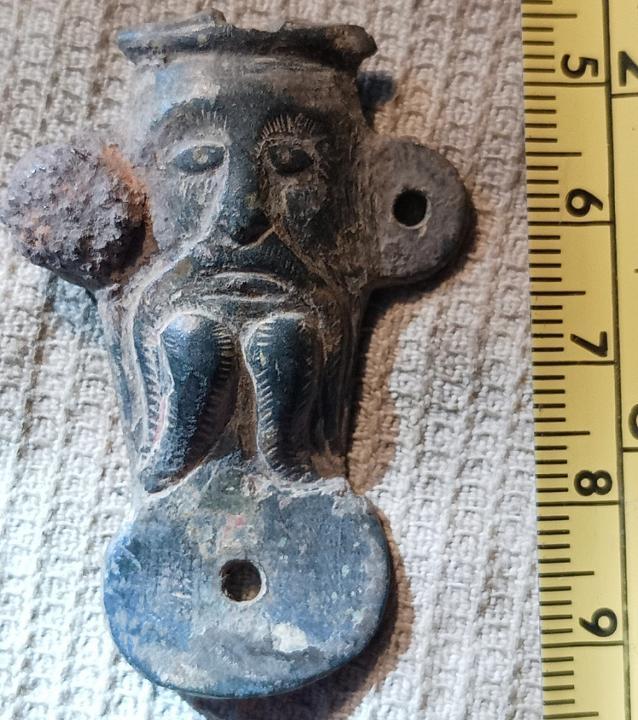 Утро доброе. Совершенно верно, одна заклёпка ( или гвоздь) из железа, шляпка как у гриба выпуклая, осталась в ухе правом. Интересно кого изваяли с такой характерной раздвоенной или заплетённой в косы бородой.