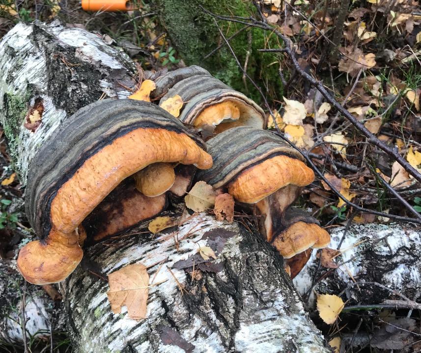Тёмные паразитируют на берёзе, а оранжевые на тёмных грибах паразитируют, такой двойной симбиоз получился 🙂 ну и красиво
