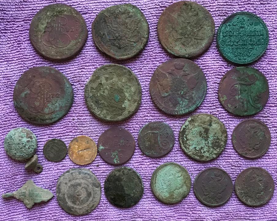 На опушке попалась кучка монет. Смесь от Екатерины2 до Николая1. Как азартно было вытаскивать одну монетку за другой! Первый раз нашла пятак КМ и кольцевик, но состояние - слёзы 😪