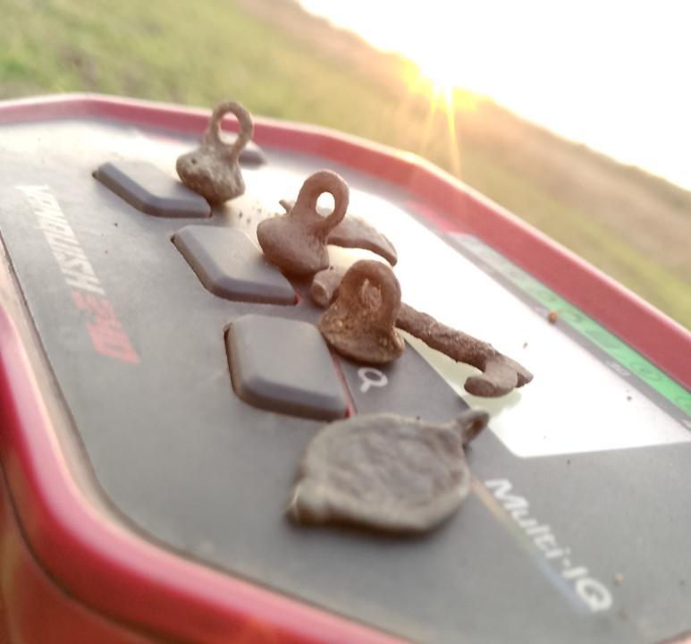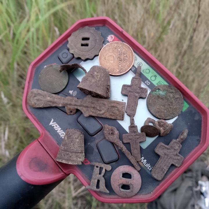 ....ночью термометр опустился до минус пяти. Утро ,с первым заморозков , выдалось солнечным с обилием иния на траве. Не много не здоровилось , но настроение было поднятое , тем более праздник такой хороший сегодня. Сходил на кладбище, поминуть маму и бабушку , Вера и Любовь у меня они . Хоть и плоховато , но охота в поля в крайние дни осени, рвется душа . Решил сходить на часок , опять поле закружило и так и не дошёл до леса ))) Но и полюшко порадовало 4 монетками и пластинкой узорной. Всем добра и мира. С уважением Федор.