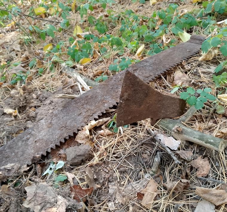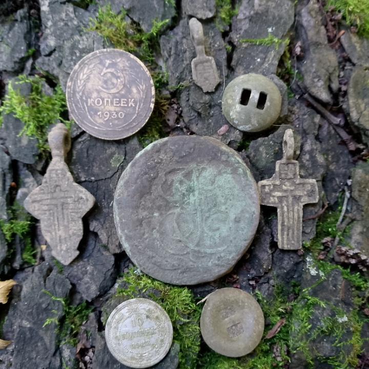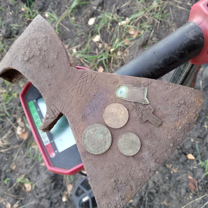 Эх, погода то какая стоит. Ноги в лес так и тянут. Далеко сегодня не ходил, так как вчера был приличный марафон и ноги далёко бы не унесли . Битое вроде место , а всё равно радует ещё находками. Под огромной сосной , нарвался на схрон лесорубов. Двух ручная пила и топор . Сразу вспомнился, Тургеневский Бирюк . Пилу пока припрятал там же, а топор забрал. Везёт мне на топоры) побродив не много и уже собираясь домой , поймал четкий сигнал , глубокий . Провозившись, с корнями минут пять , извлёк на свет Божий, такой красивый масончик 2 копеечный и в той же ямки пуговка лежала , два в одном .Видно чей-то мини схрон) Только не давно вспоминал про масоны, в этом году не попадались , а тут , пожалуйста, получите. Поблагодарив Лешего и лес побрел домой , зацепив уже на выходе советик "рамочник" не читаемый. Вот и ещё одна страничка , лесной книги перевёрнута. Всем добра и мира.