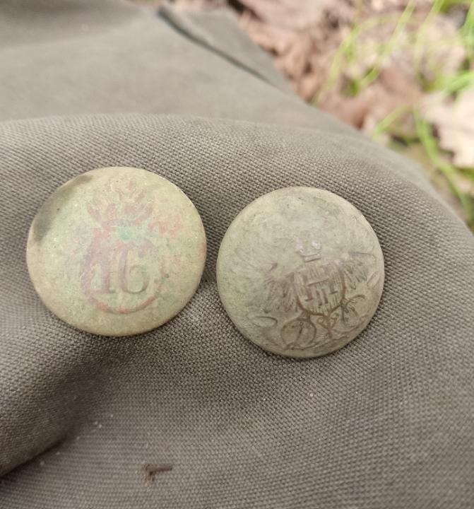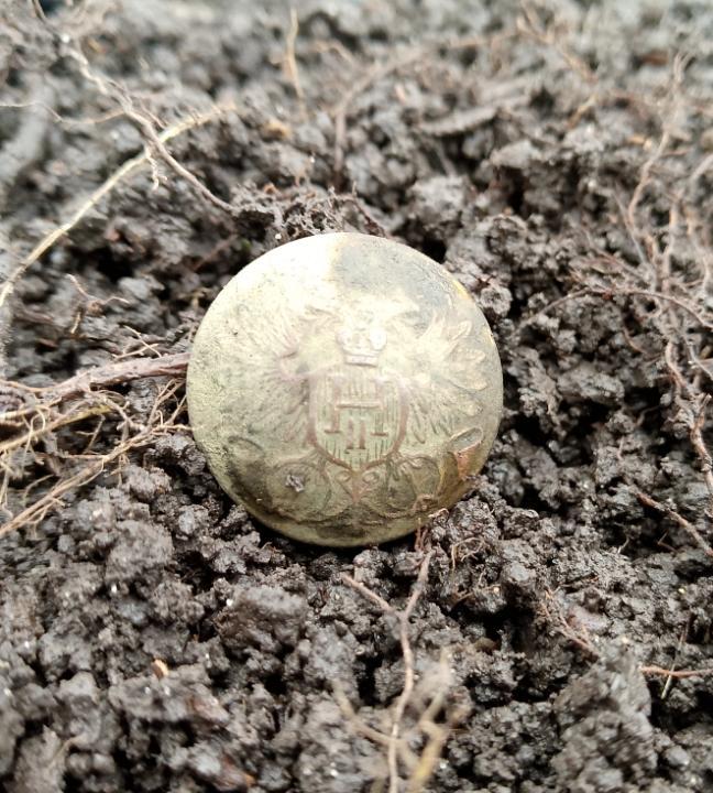 Посидел , покурил , рассказал Лаврентию про городскую жизнь и будни строительные ,отправились дальше . Решил перевалить через овраг не большой , заросший кустарником , опять подняли лося бедолагу и он ругая нас на своём лосином ,удрал в глубину леса . Вот и склон уже чистый пошёл, включаю ванквиш и делаю два взмаха, четкий сигнал . Пуговка орлянка , подумал я сначала , протираю и вижу , что не просто орлянка , а на трубах то Орёл, да не простой , а с вензелем IMG_20260412_143538_400.thumb.jpg.1d08e40c3c431a145f06895e8d2afe1a.jpg( позже мне подсказали , что это егермейстерская ) , радостный я помахал в то направление , куда лось убежал и мысленно подумал , может душа покойного егермейстера переселилась в лося и бродит не прикаяная по лесу....