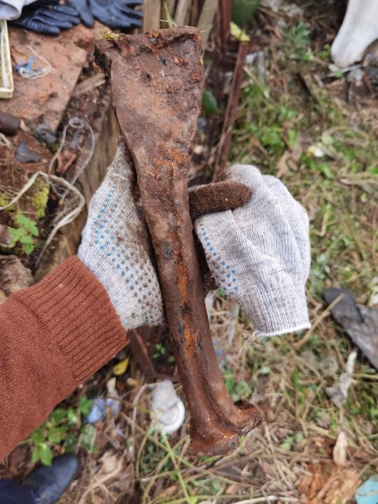 Коллеги, подскажите пожалуйста, что это может быть. С приплюснутого конца сварка не идентифицирована, как будто бы просто расплющено. Верхний плоский конец не острый. Под ржавчиной чернота, под которой уже металл, по весу и цвету железо.