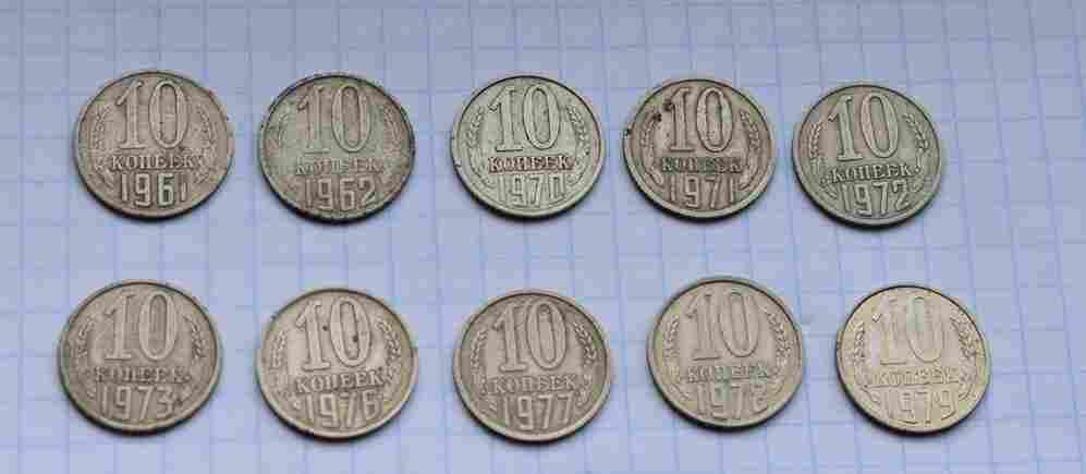10 копеек 1961-1979г, 10 штук без повторов.Окончание 17.10.2025г в 22 -00 мск