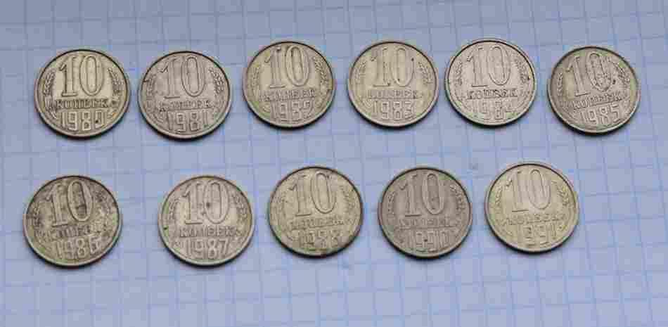 10 копеек 1980-1991г, 11 штук без повторов.Окончание 17.10.2025г в 22 -10 мск