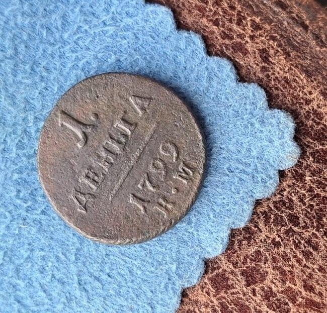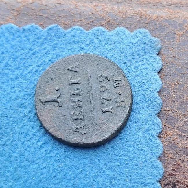 Описание лота. Деньга 1799 КМ, монетка откопана, помыта, почищена. Фото при дневном освещении у окна.