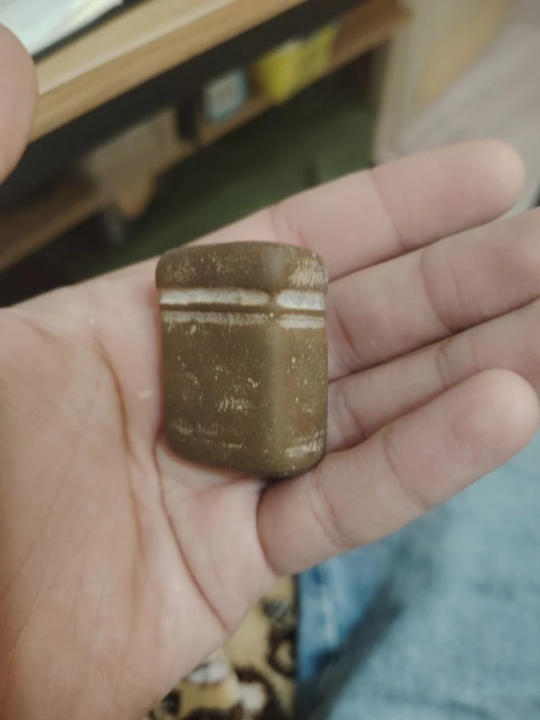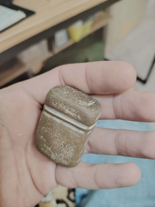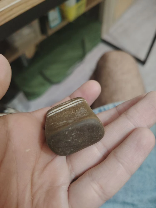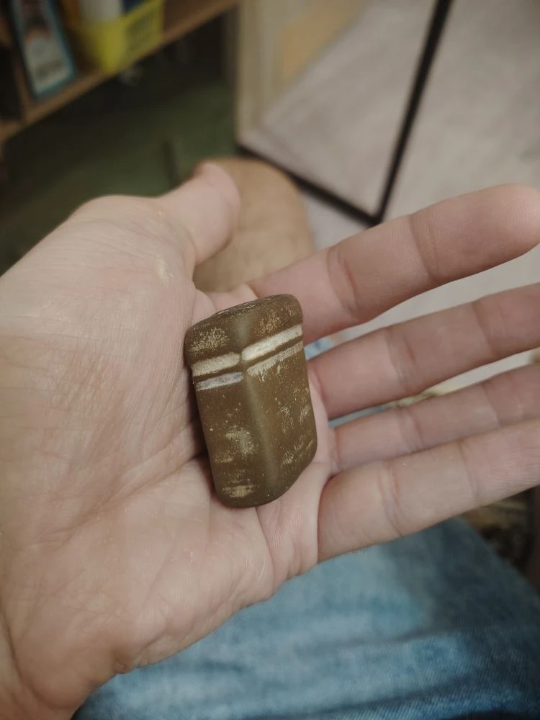 Некоторое время назад нашел вот-такую штуку. Облазил интернет и описанием и по фото - не нашел, что это такое. Но судя по всему не природное образование. Если постучать - похоже на камень. На фото видно - темный с одной стороны.И с другой стороны какой-то темный ободок. Найдено в местах боев, на дне реки. В камнях осенью, когда река пересыхает сильно.