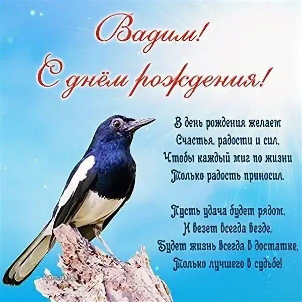 Вадим! От всей души поздравляю Вас С Днём Рождения! Желаю крепкого здоровья, счастья, исполнения желаний! Пусть жизнь, как яркая мозаика, складывается из светлых красок радости, незабываемых событий, а каждый новый день дарит удачу и прекрасное настроение!