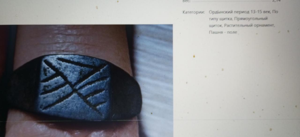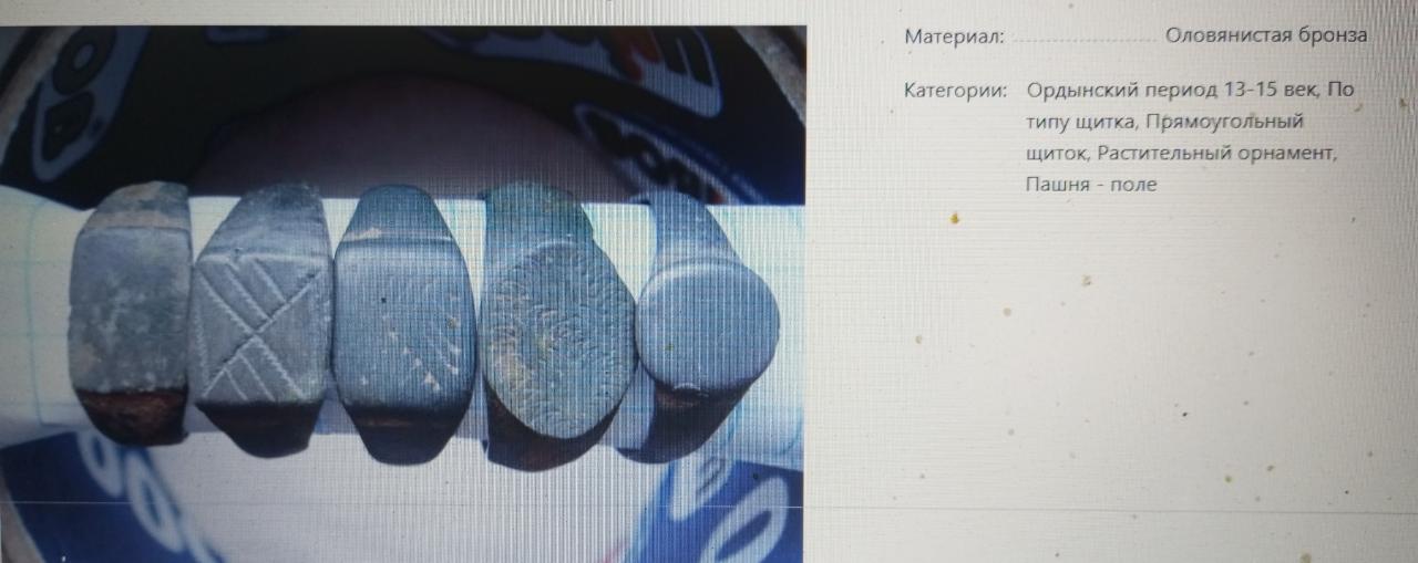 Написали , что это Ордынский период . 13-15 вв. По типу щитка - прямоугольный щиток . Растительный орнамент . Пашня - поле .