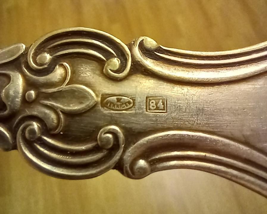 Вроде как данная фирма производила посеребренные приборы. Но тут стоит клеймо 84. И на вид серебро. В местах, где ложка стёрлась от бытования, не проступает медь, как это бывает с посеребренными приборами.