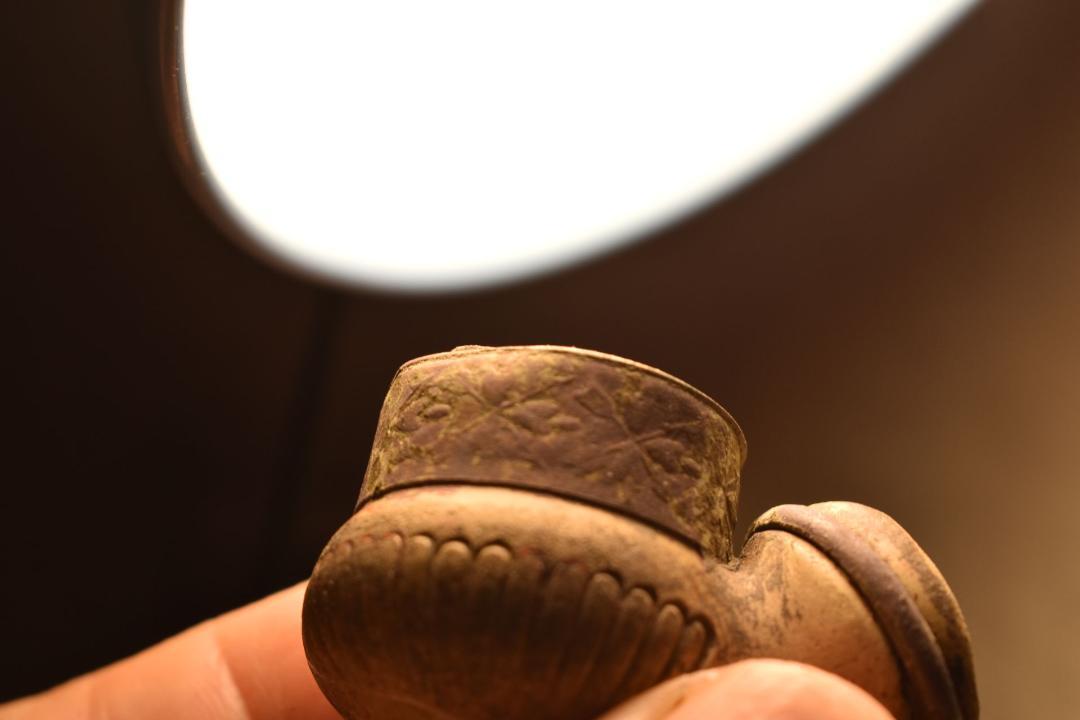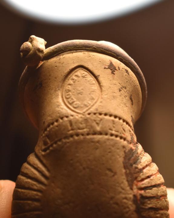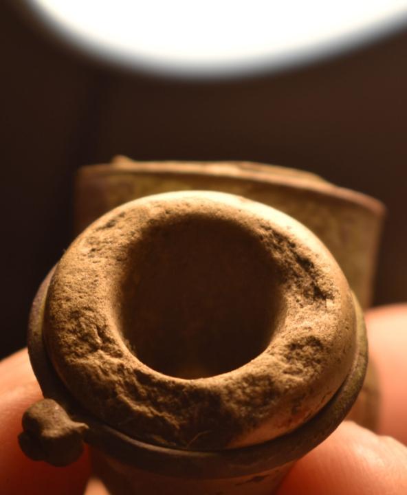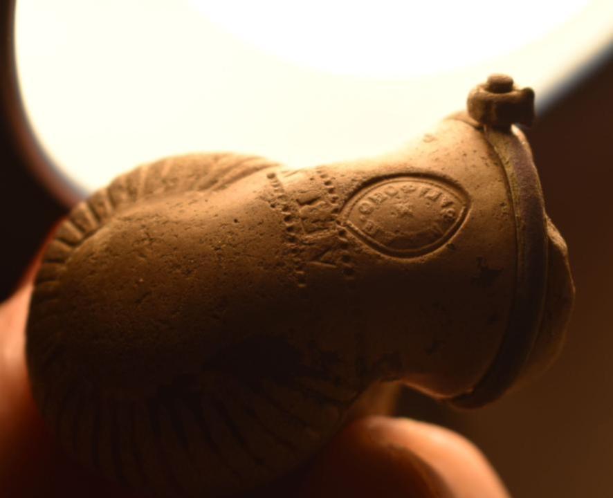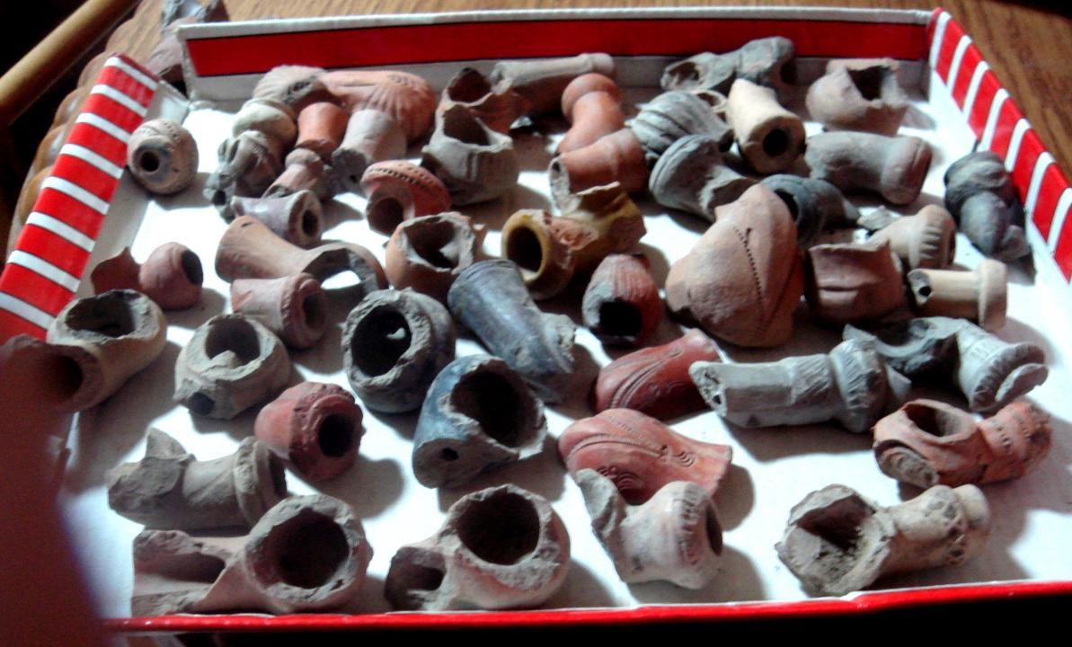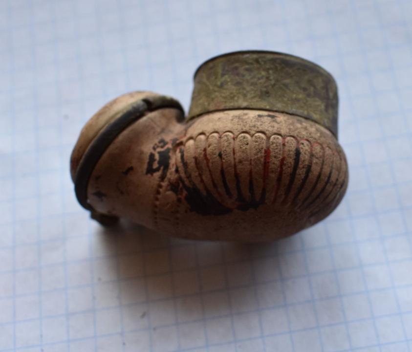 Находка из Чувашских лесов..Курительная трубка из обожженой глины, место вставки мудштука стянуто хомутиком из проволоки.Заправочное отверстие для табака имеет внутри вставку из латунного цилиндрика,а в верхней части украшено широким кольцом с растительным орнаментом и перекрещенными стрелами. На донышке   трубки имеется печать элипсовидной формы, из которой различима надпись(верх)- м.?.д.п , низ-агафоно.
