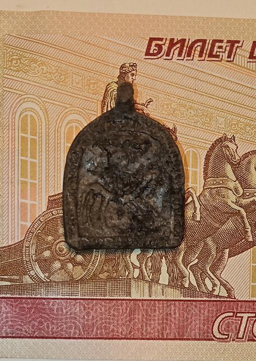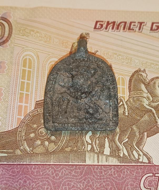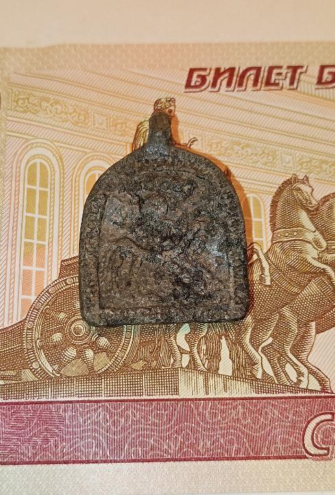 Икона изготовлена из свинцово-оловянистого сплава. Предметы из этого материала после долгого нахождения в земле чаще всего рассыпаются в руках, поэтому целый предмет довольно большая редкость.