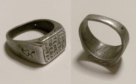 100% italian handmade jewel! Sator ring made with the technique of lost wax casting in my lab in Rome. ring head: 1,2cm x 1cm Sator (from serere=to sow) Sower, planter; founder, progenitor (usually divine); originator Arepo unknown, likely an invented proper name; its similarity with arrepo, from ad repo, 'I creep towards', may be coincidental Tenet (from tenere=to hold) holds, keeps; comprehends; possesses; masters; preserves Opera (noun) work, care; aid, service, effort/trouble; (from...