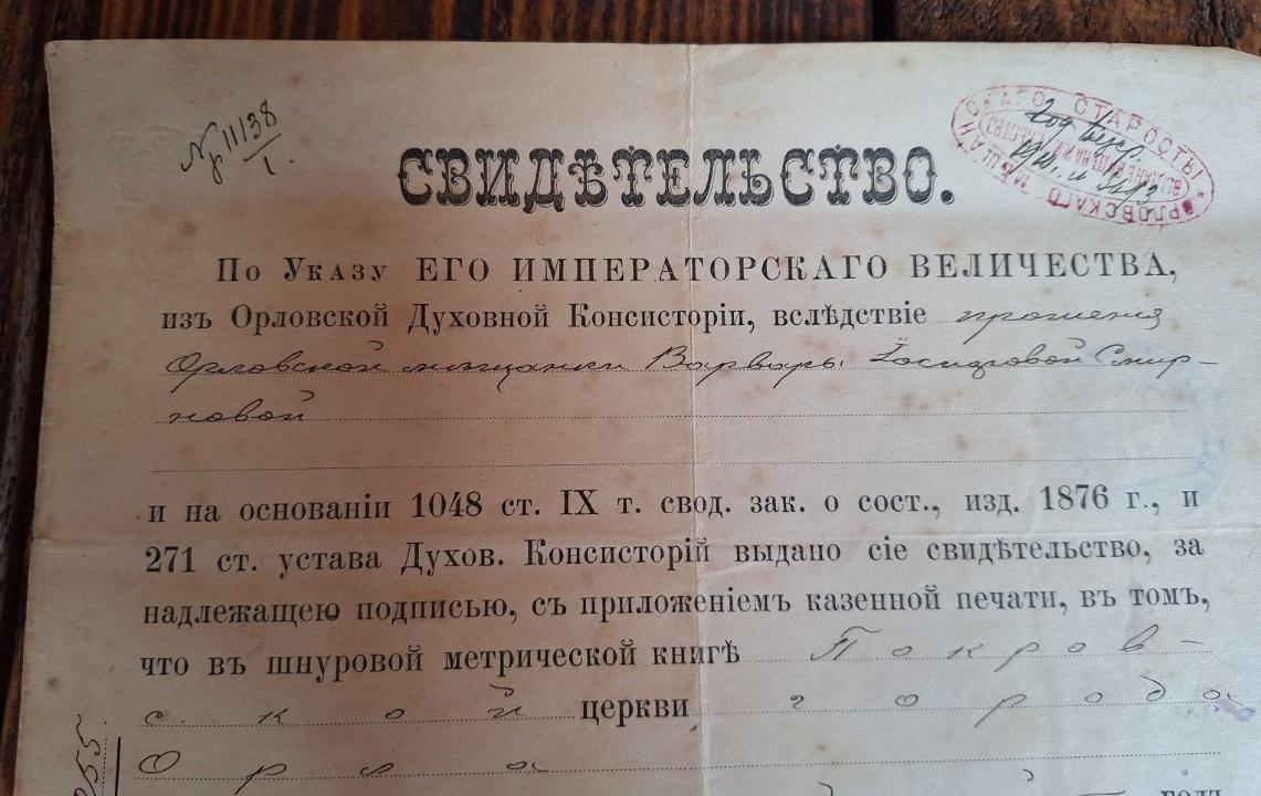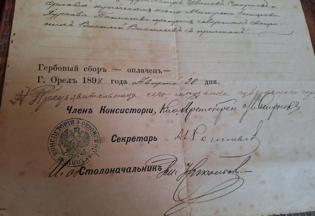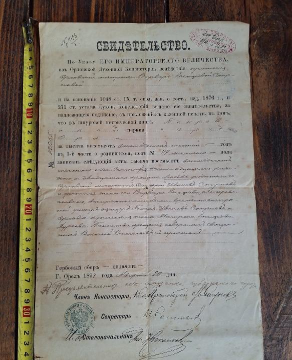 Свидетельство из Орловской Духовной Консистории 1898 г до 22,02,26 в 22,00