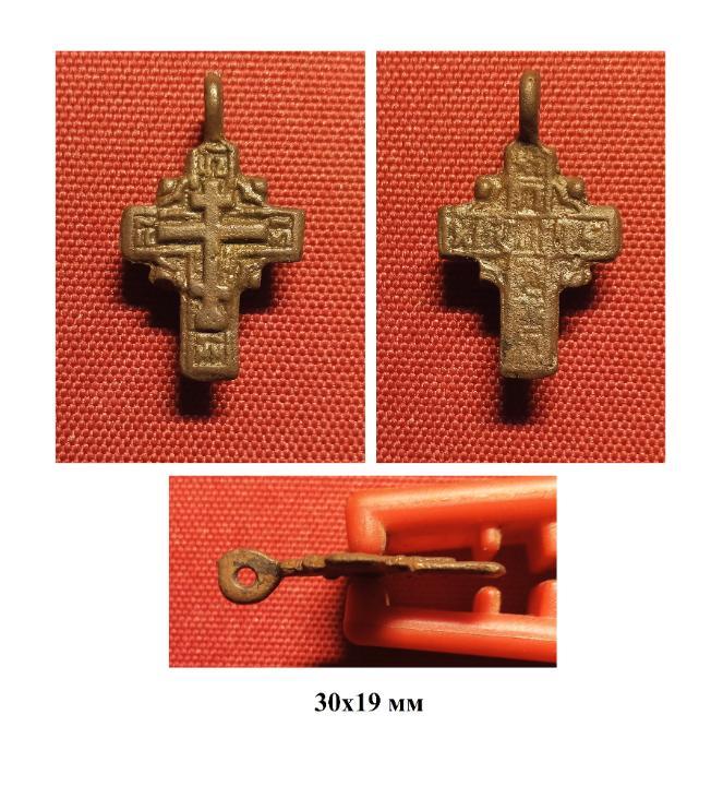 Предлагаю нательный крест 17 века. Крест двухсторонний, с обратной стороны в теории должна быть молитва, или обращение к Господу, но в реалиях такое было далеко не всегда, нередко неграмотные резчики, копируя изношенные оригиналы или литьевые формы, рисовали буквы "от балды"
