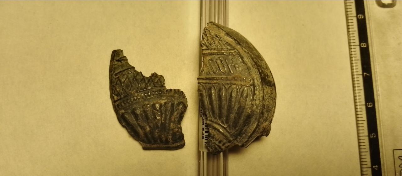 Всем добра! Уже на двух разных местах по империи попадаются частички какого то предмета, вроде и ерунда какая то, но и узнать интересно что такое было) Может распознает кто нибудь по остаткам что это. Материал сам не пойму по весу вроде как свинец но не гнëтся. Остаток надписи "мсон" - самсон может было как вариант. Изнутри видимо полый был.