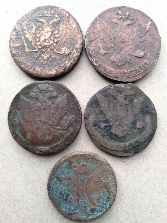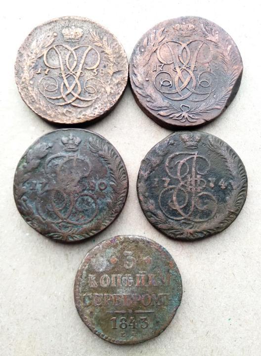 5 копеек 1758 г, 5 копеек 1758 г, 5 копеек 1774 г, 5 копеек 1780 г, 3 копейки 1843 г.